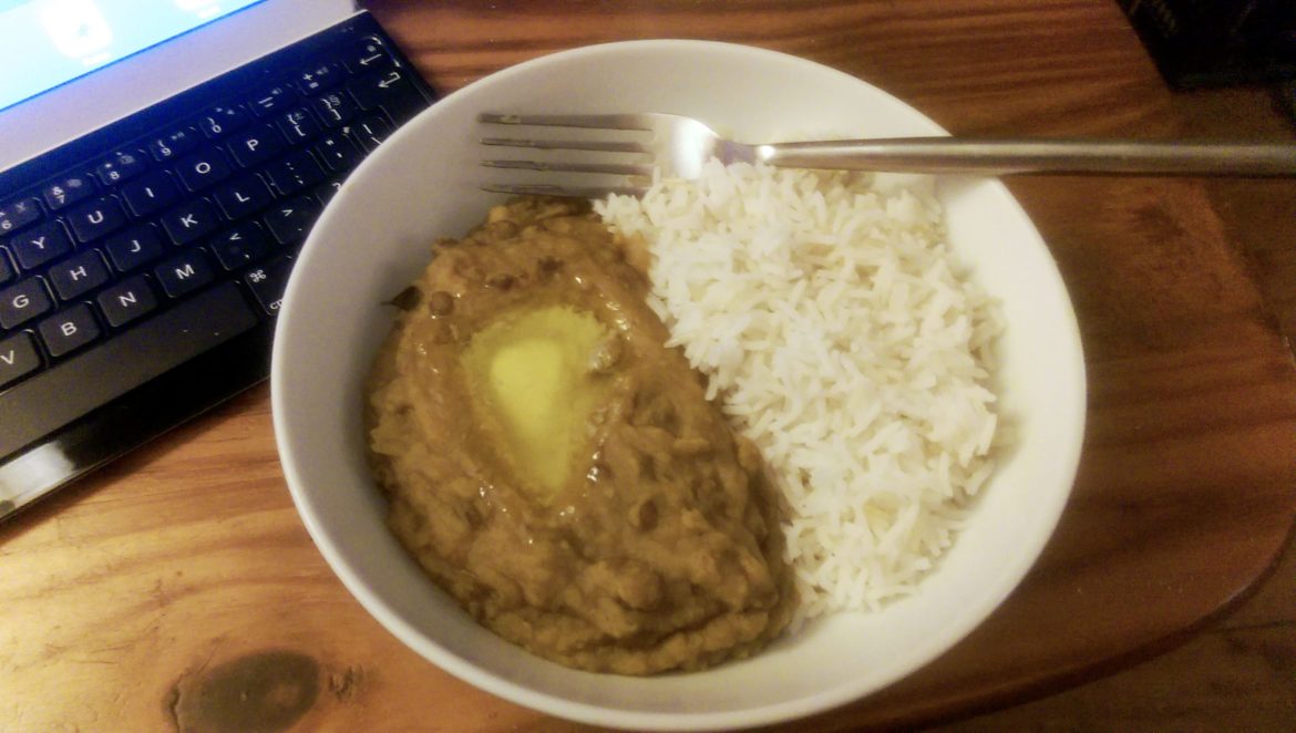 Improvised store-cupboard dhal, for when you can’t be bothered with a cookbook.
